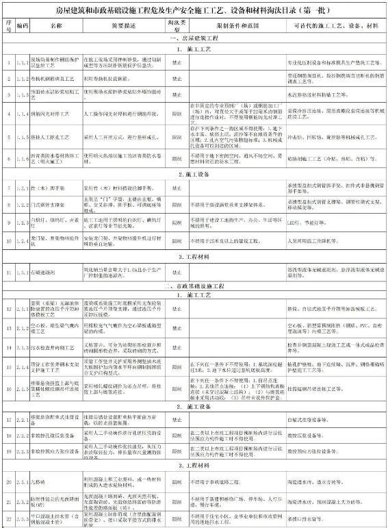 房屋建筑和市政基礎(chǔ)設(shè)施工程危及生產(chǎn)安全施工工藝、設(shè)備和材料淘汰目錄(第一批)