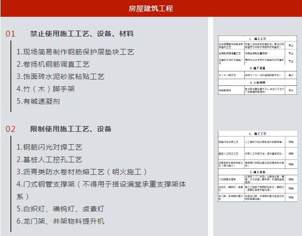 (一)發(fā)布之日起9個月后,全面停止在新開工項目中使用本《目錄》所列禁止類施工工藝、設(shè)備和材料。 (二)發(fā)布之日起6個月后,新開工項目不得在限制條件和范圍內(nèi)使用本《目錄》所列限制類施工工藝、設(shè)備和材料。 (三)可替代的工藝、設(shè)備、材料包括但不限于《目錄》中所列名稱。 (四)《目錄》中列出的工藝、設(shè)備、材料淘汰范圍,適用于新建、改建、擴建的房屋建筑和市政工程,不適用于限額以下工程、臨時工程、日常維修養(yǎng)護工程。